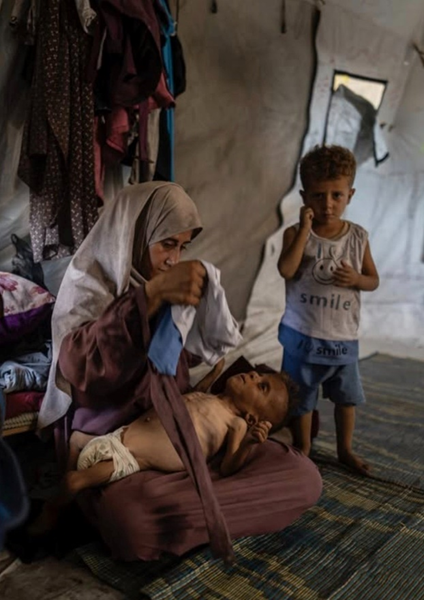La légende disait : « Samah Matar, une mère palestinienne déplacée, tient son fils Youssef, souffrant de malnutrition, dans la ville de Gaza. »